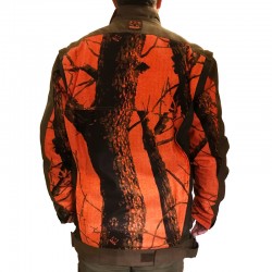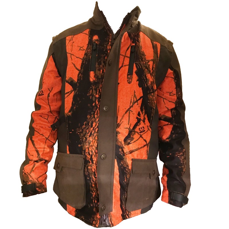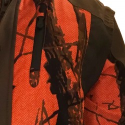 Deux en un, elle est pratique pour la chasse. Réalisée dans du tissu marron avec des motifs de camouflage orange sous un fond en tweed, ce vêtement est imperméable et respirant.