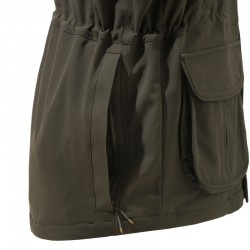 Cette veste de chasse a plusieurs poches : une poche carnier dans le dos, une large poche avant et des poches internes.