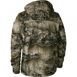 La marque a sélectionné le camouflage RealTree Excape, dans du tissu fabriqué en softshell (assemblage de 3 matières, 100% Polyester) la rendant respirant, déperlant, stretch, silencieux, léger, plutôt chaude et coupe-vent.
